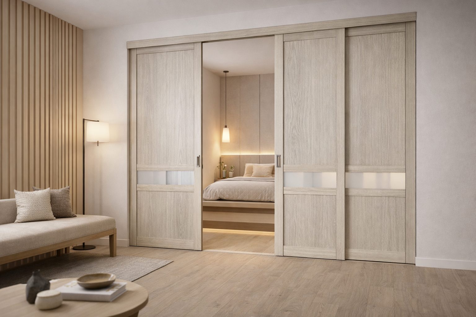 Удобнее всего выбирать оттенок из той же цветовой температуры, что и пол: тёплый пол – тёплые древесные оттенки перегородки, холодный серый пол – Дуб Грей, Серое дерево или нейтральный Белый. Точное совпадение не обязательно – важнее, чтобы оттенки не конфликтовали между собой.